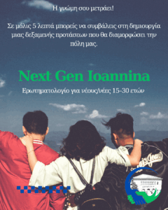 Το Δημοτικό Συμβούλιο Νέων Ιωαννίνων, μαζί με τον Δήμο Ιωαννιτών, στο πλαίσιο της υποψηφιότητας για την Εθνική Πρωτεύουσα Νεολαίας 2026, έφτιαξε ένα ερωτηματολόγιο αποκλειστικά για εμάς – τους νέους και τις νέες 15–30 ετών.