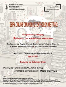 Η 4η online ομιλία “Φιλολογία και Εκδοτικοί Οίκοι” θα πραγματοποιηθεί διαδικτυακά την Παρασκευή 28 Νοεμβρίου 2025 και ώρα 19.00.