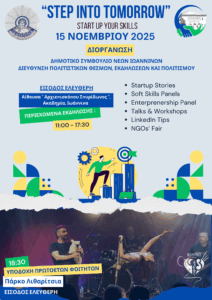 H Μονάδα Υποστήριξης Φοιτητών συμμετέχει και σας προσκαλεί στο «Step into Tomorrow – Start Up Your Skills» που θα διεξαχθεί στην αίθουσα Αρχιεπισκόπου Σπυρίδωνος (Ακαδημία), που αποτελεί μια πρωτοβουλία του Δημοτικού Συμβουλίου Νέων και φιλοδοξεί να εμπνεύσει, να ενθαρρύνει και να δώσει ώθηση στη νέα γενιά μέσα από ομιλίες, panels και workshops.