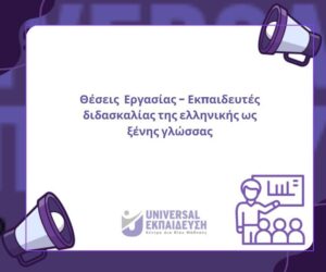 H UNIVERSAL Εκπαίδευση Α.Ε. (Κέντρο Διά Βίου Μάθησης) με μακρόχρονη παρουσία στον χώρο της Επαγγελματικής Εκπαίδευσης και Κατάρτισης, αναζητά εκπαιδευτές για την διδασκαλία της ελληνικής γλώσσας ως ξένης γλώσσας (ελληνομάθεια), κατά προτεραιότητα στις περιοχές Αττική, Θεσσαλονίκη, Λάρισα, Ημαθία, Φθιώτιδα, Βοιωτία, Καβάλα, Δράμα, Έβρο και Πρέβεζα.