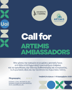 To Πανεπιστήμιο Ιωαννίνων, συμμετέχοντας στην Ευρωπαϊκή Συμμαχία Πανεπιστημίων ARTEMIS, ανακοινώνει με χαρά την έναρξη υποβολής αιτήσεων για τη Δράση ARTEMIS Ambassadors για το ακαδημαϊκό έτος 2025–2026.