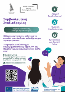 Μια νέα ακαδημαϊκή χρονιά ξεκινάει και η Μονάδα Υποστήριξης Φοιτητών (Μ.Υ.Φ.)- Γραφείο Διασύνδεσης και Επιχειρηματικότητας είναι εδώ για να υποστηρίξει τους φοιτητές/τριες  και απόφοιτους του Πανεπιστημίου Ιωαννίνων σε θέματα σταδιοδρομίας.
